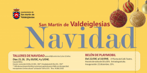 Para estas Fiestas el Ayuntamiento de San Martín de Valdeiglesias ha programado un variado programa de actividades en el que destaca el gran Belén de Playmobil que estará instalado en la sala de exposiciones del Café-Teatro, con más de un centenar de figuras, que se podrá visitar del 22 de diciembre hasta el 10 de enero en horario de 10h a 20h.