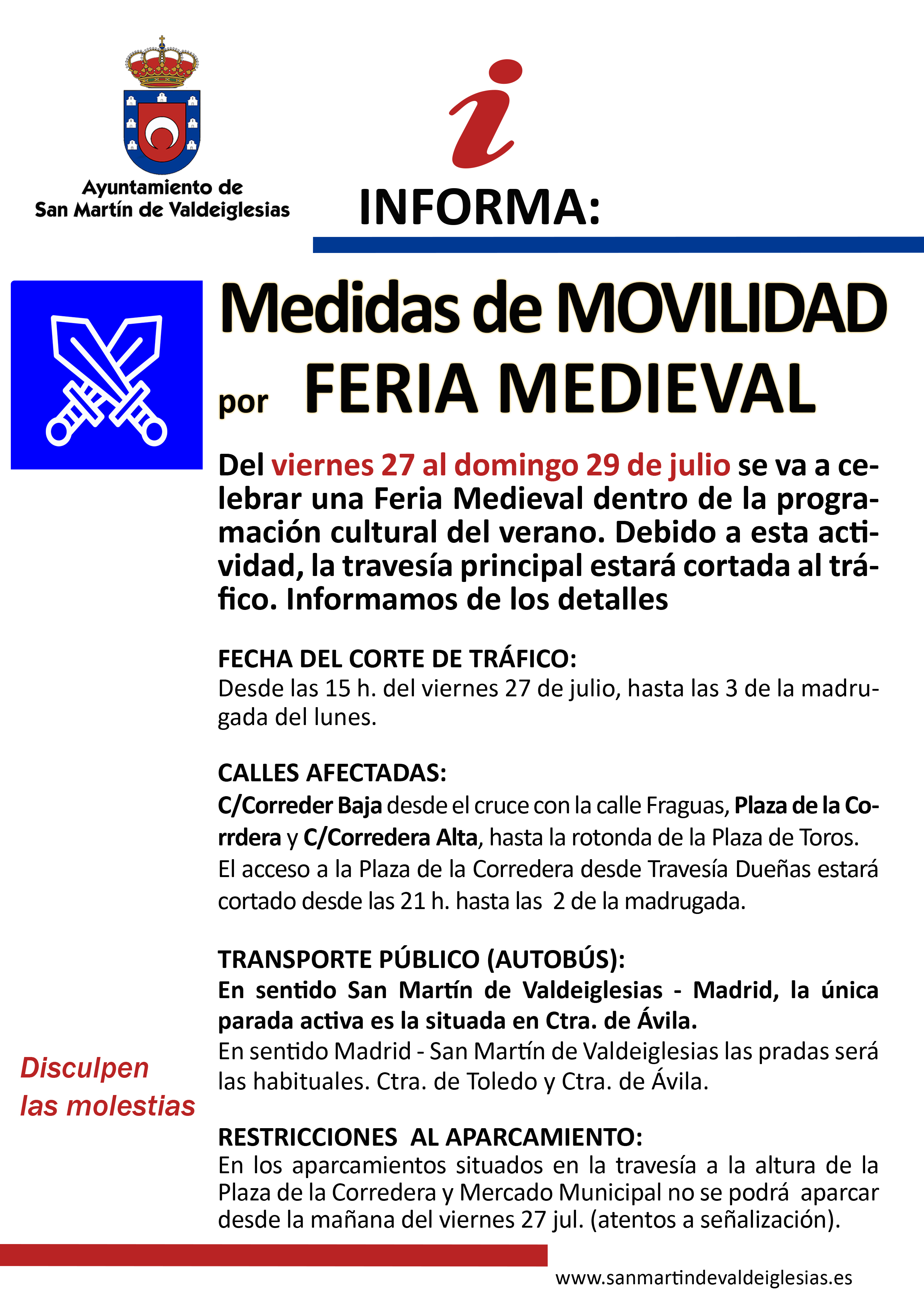 Debido a que el evento se desarrolla en la travesía principal, la concejalía de Movilidad ha activado un plan especial para informar a los vecinos de las restricciones al tráfico rodado. La calles Corredera Alta y Baja se cortarán al tráfico desde las 14 h. del viernes hasta las 3 de la madrugada del lunes. (Descargar medidas de movilidad en jpg).