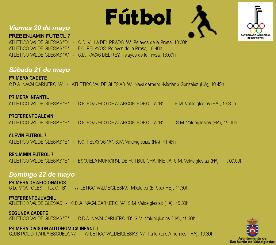 – Juvenil. Méntrida – San Martín. Sábado 21 de mayo, 10:00h. Instituto de Méntrida.