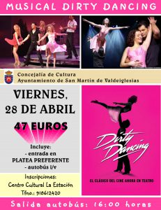 marzo 14, 2017La concejalía de Cultura de San Martín de Valdeiglesias organiza una excursión a Madrid el próximo viernes 28 de abril para asistir a la representación en el Teatro Nuevo Alcalá de Madrid de «Dirty Dancing», el musical. Los fans podrán revivir todos los números musicales, incluido el archiconocido «The Time of My Life» de la escena final, premiado con el Oscar y el Globo de Oro.