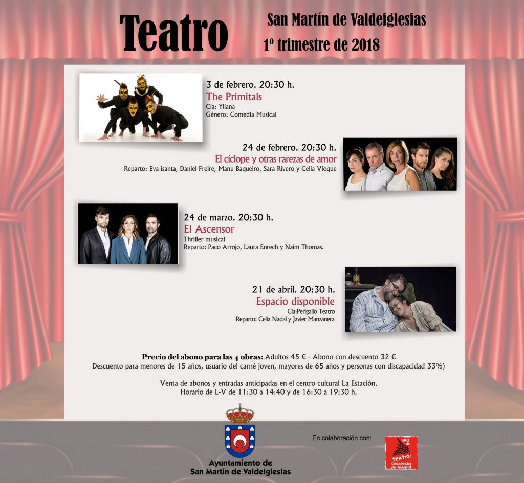 enero 22, 2018Cuatro son las obras de teatro que componen la programación del trimestre en San Martín de Valdeiglesias. La calidad de las obras, con compañías y actores de primera fila es la característica predominante de la temporada, junto con la variedad de género para llegar a todos los públicos.